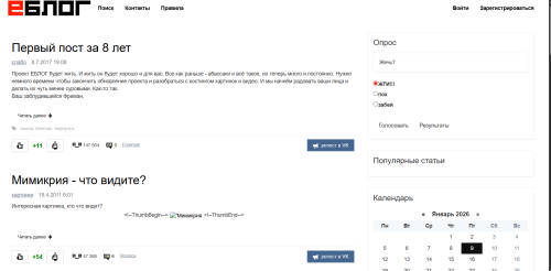 Встряхиваю пыль с темы. Гулял по "улитке", и нашел сайт Еблог. Выложили сайт на "улитке" в 2004 году. Сайт заброшен, последняя запись была сделана в 2017 году. Порыскал в вебархиве, некогда там были сотни людей, но сейчас почему то от сайта остались одни кусочки. В какой то момент сайт очень сильно сжали.