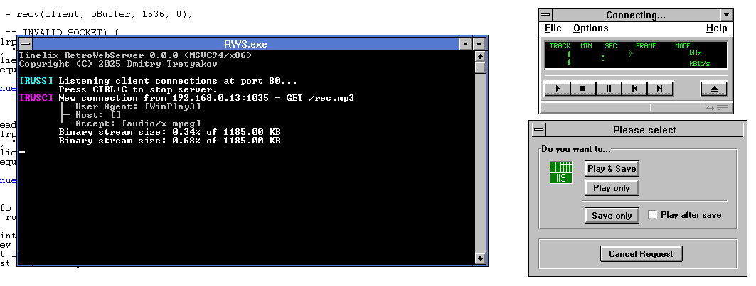 Что я конкретно сделал? В реализации своего веб-сервера я сюда добавил поддержку HTTP/1.0, а также нестандартный MIME-тип для загрузки MP3-файлов. Обычно стандартным MIME-типом является audio/mpeg, но WinPlay3 понимает только audio/x-mpeg вместе с HTTP/1.0. ![]() Следовательно, добавив вот этот костыль, можно было слушать музыку по сети 30 лет назад. Это были те времена, когда Winamp'а ещё не было, а WinPlay3 только-только появлялся. Последний раз редактировалось tretdm, 1 неделю назад в 04:48. |