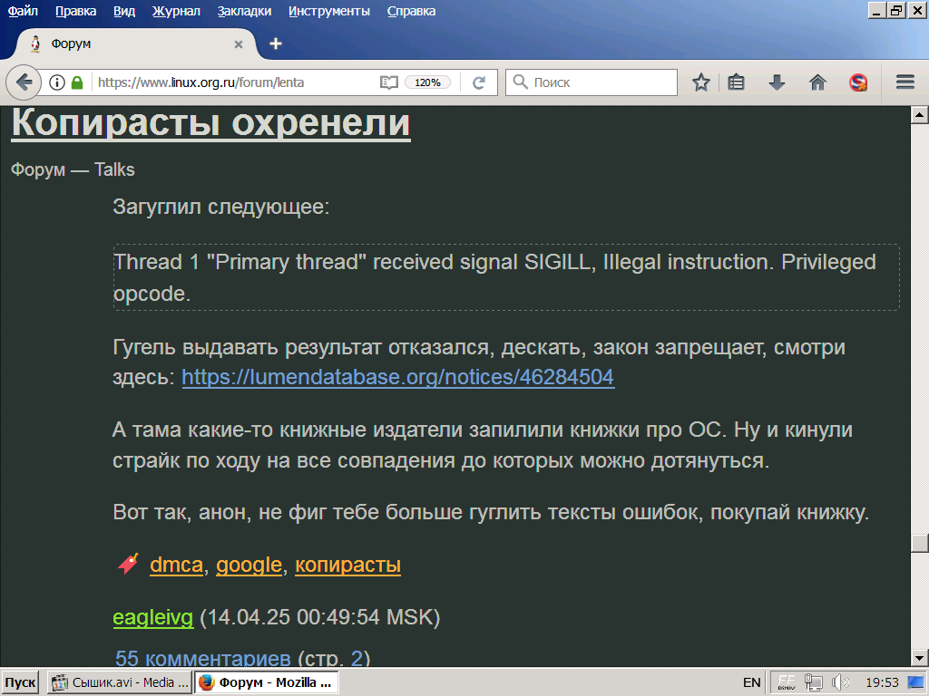 Некоторые замечания по поводу сети. Сейчас, последние три дня. Я не знаю других браузеров кроме Firefox, но на тех сайтах где постоянно отираюсь ФoнTаHkа, М4uJpyIIIka c не поддерживаемым браузером, а это те которые Семерка (Виндовс) поддерживала - уже зайти в несколько раз дольше. Вот так. Вовремя я на Чирик перешёл. Я юзаю 115 портейбельный и самый последний 138. Так вот 115 уже не торт! |